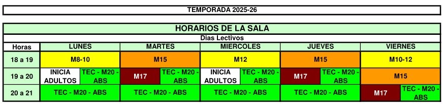 Categoría M-15: Martes y Jueves de 18:00 a 19:00. Viernes de 19:00 a 20:00 hrs.